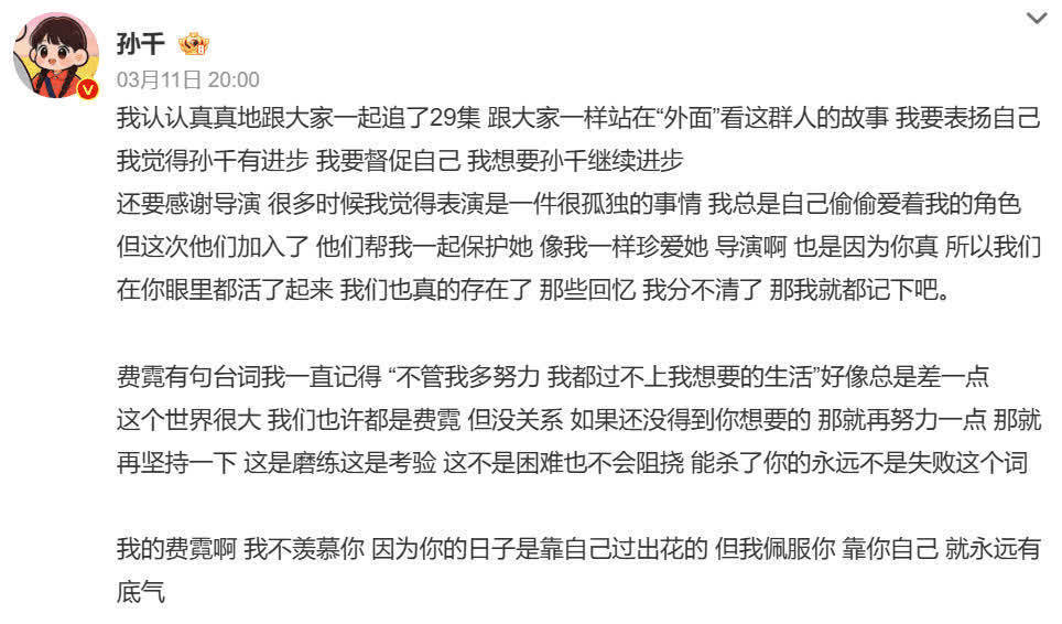 而在收官之后,孙千发布的一篇小作文,更是让人感动不已。